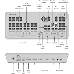 Il comprend quatre entrées HDMI standard, une sortie USB pour webcam, une sortie HDMI, un mixeur audio Fairlight avec EQ et dynamique, des DVE pour des effets d’image dans l’image, des transitions, un incrustateur chromatique sur fond vert, 20 images fixes pour les titres dans la bibliothèque de médias et le logiciel ATEM Software Control gratuit.